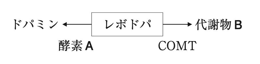 下図に示すように、レボドパは、末梢で酵素Aが触媒する反応によってドパミンに、カテコール-O-メチルトランスフェラーゼ(COMT)によるメチル化によって代謝物Bに変換される。以下の記述のうち、正しいのはどれか。2つ選べ。