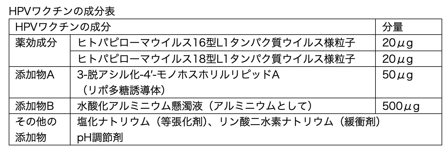 34歳女性。この女性の12歳の娘に市からヒトパピローマウイルス(HPV)ワクチン接種についてのお知らせが届いた。娘はHPVワクチンの接種歴がない。この女性はHPVワクチンの説明を聞くため、市から送られた下の成分表を含む資料を持って娘と一緒にかかりつけ薬局に来局した。そのHPVワクチンの成分、投与方法、そして免疫応答を高める成分(アジュバント)が入っていることなどを、下の成分表を確認しながら薬剤師が説明した。