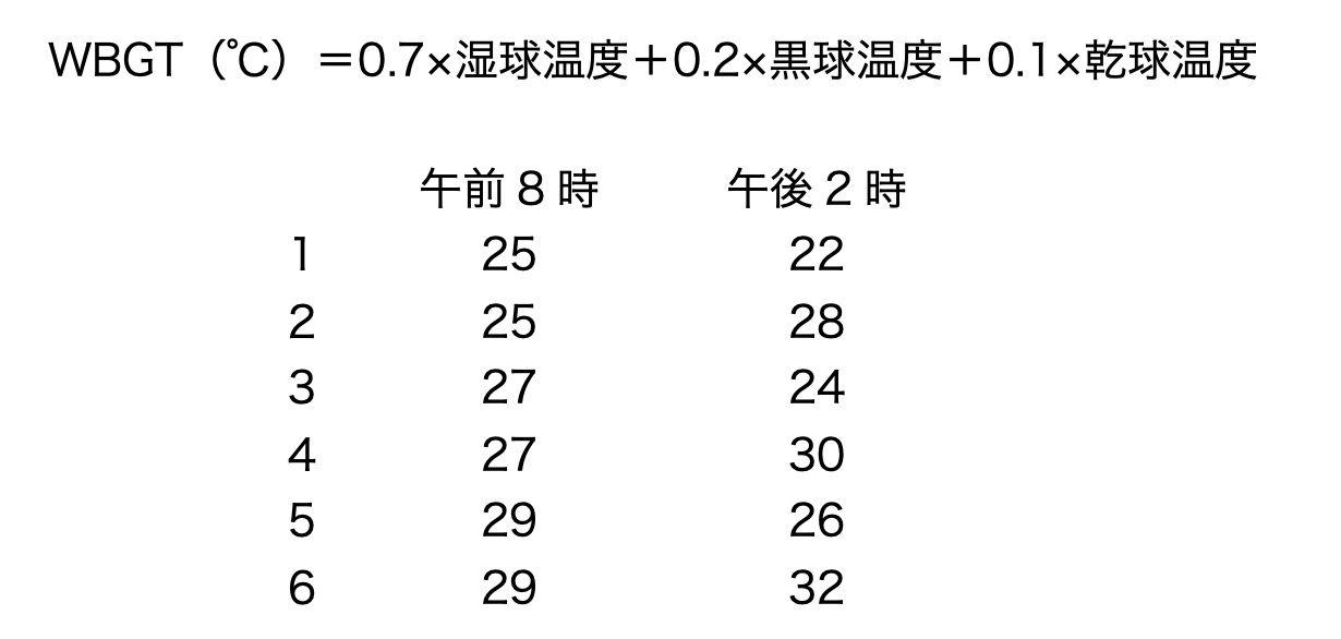 ある高校で、夏休み前の7月に野球大会を開催することとなった。大会当日に、熱中症を防止する目的で、体育の教諭がグラウンドの中央付近の高さ約1mの地点で、乾球温度計及び黒球温度計を用いて温度を測定した。また、同時に電気式湿度計で相対湿度を測定した。午前8時及び午後2時の測定結果を表1に示した。