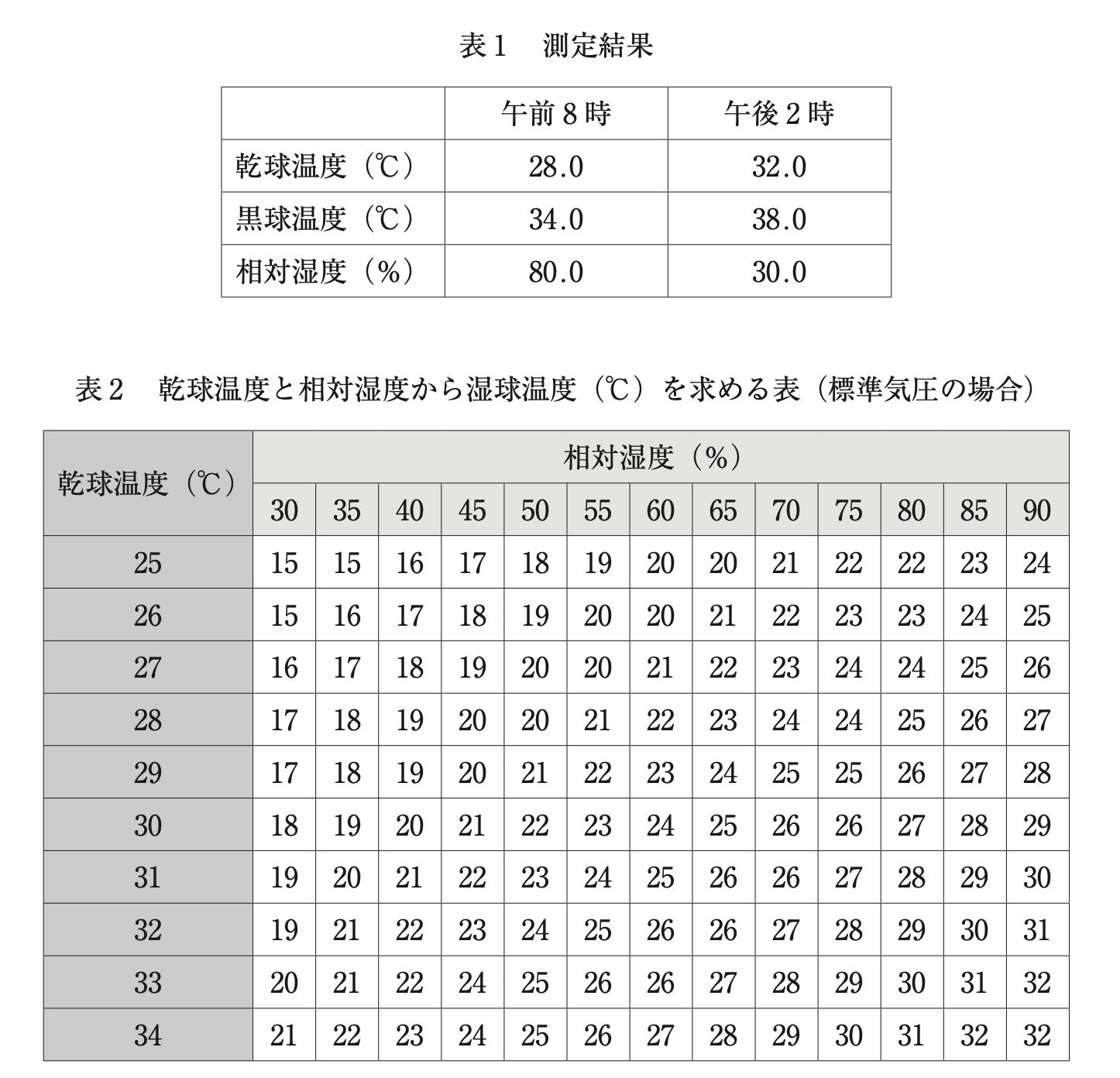 午前8時及び午後2時の暑さ指数(WBGT)の値に最も近いのはどれか。1つ選べ。ただし、気圧は標準気圧とする。また、屋外でのWBGTは次式で求められ、湿球温度は表2から求めるものとする。