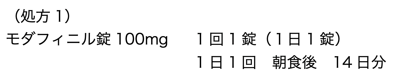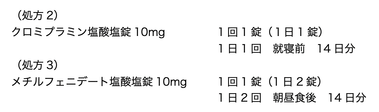 服薬コンプライアンスは良好であったが、約1ヶ月服用しても授業中の居眠り等の症状は改善しなかったため、モダフィニルが徐々に増量され、3ヶ月後には300mg/日となった。モダフィニルの増量中に、「眠りにつくときに怖い夢ばかり「みる」との訴えがあったため、処方2が追加された。その後も居眠り等の症状が十分に改善されなかったため、モダフィニル錠は、処方3に変更された。