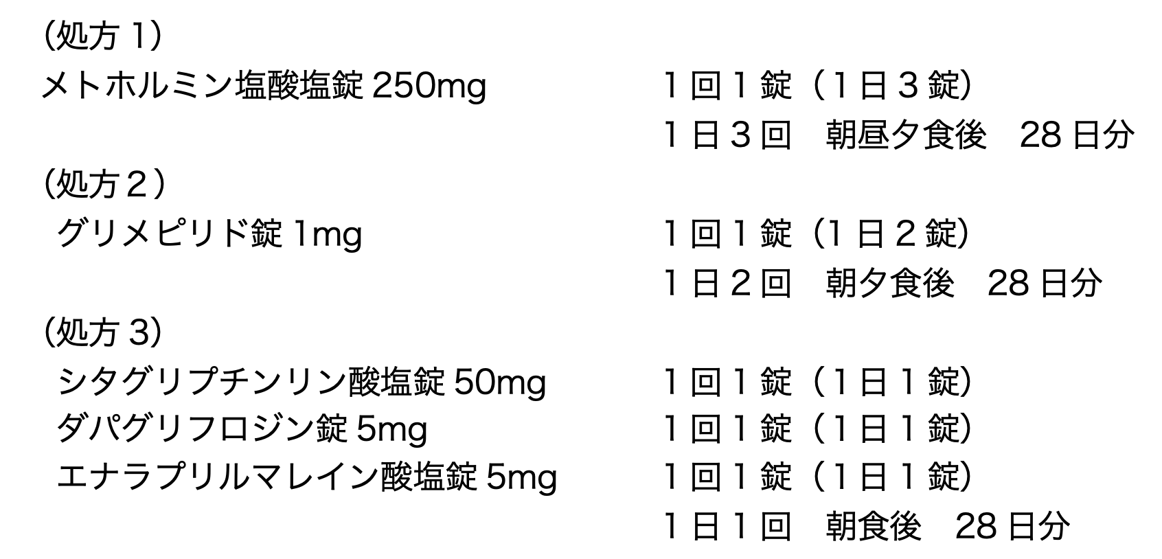 65歳男性。2型糖尿病のため処方1〜3にて治療していた。