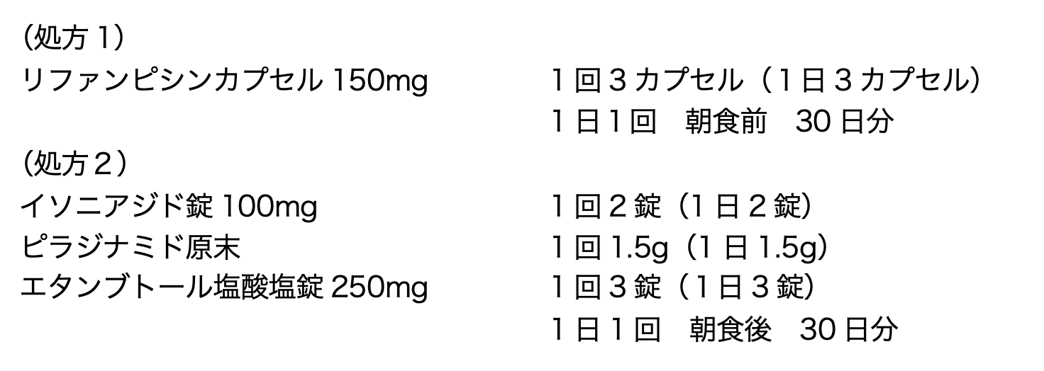 62歳女性。最近2週間ほど、咳嗽・喀痰があり、微熱も続いていた。市販薬を継続服用していたが改善せず、呼吸器内科を受診したところ、肺結核と診断された。処方は以下のとおりである。