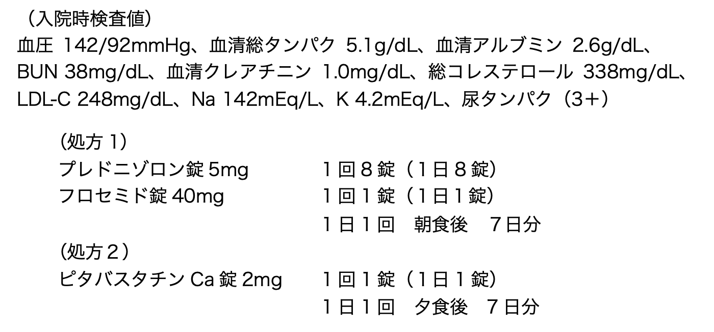 68歳女性。身長155cm、体重50kg。下腿浮腫及び尿の泡立ちを自覚するようになり、近医を受診した。タンパク尿及び低アルブミン血症を認め、ネフローゼ症候群が疑われ、精査加療のため総合病院に入院となった。検査の結果、以下の治療を開始した。