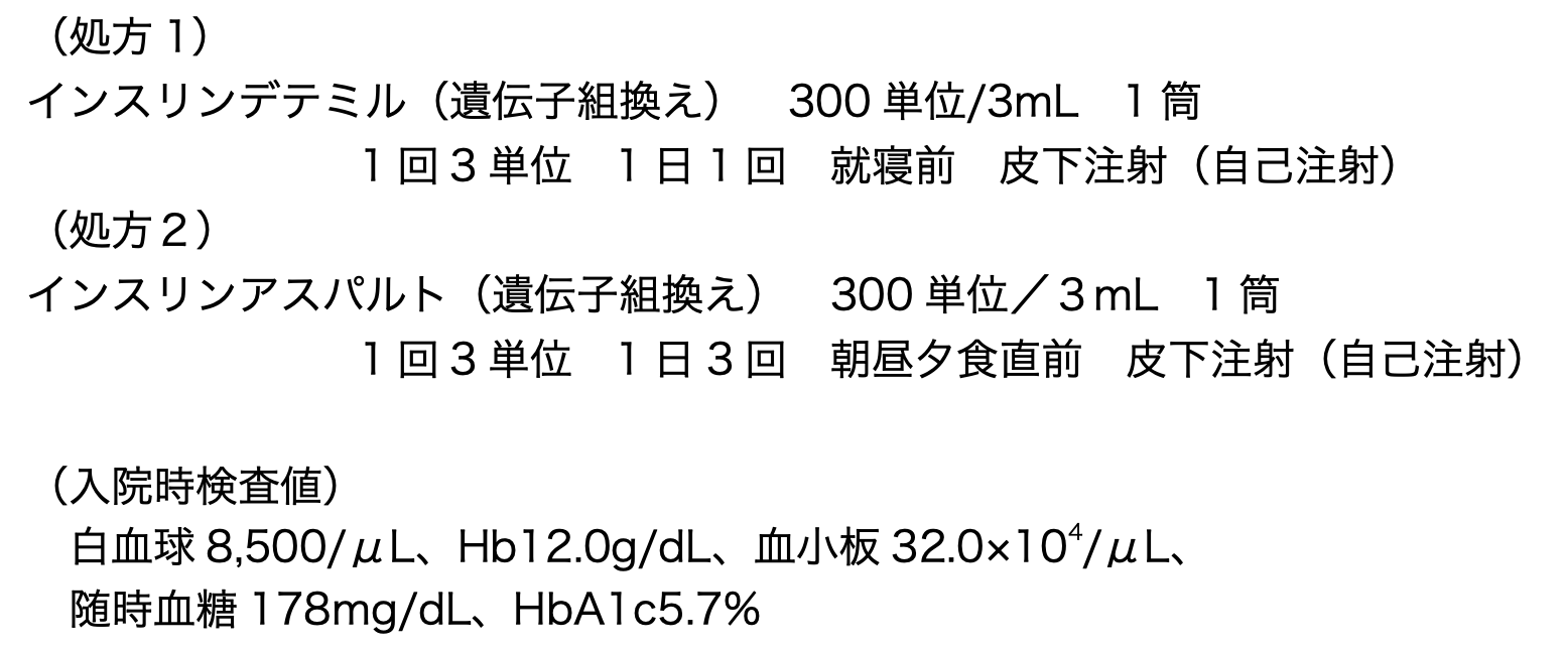 36歳女性。糖尿病の家族歴あり。妊娠のため、近隣の産婦人科クリニックを受診した。妊娠初期から定期的に血糖測定していたところ、血糖値の上昇傾向が見られ、食事療法を行っていた。妊娠24週時(妊娠中期)に実施した75gブドウ糖負荷試験で、空腹時血糖値98mg/dL、1時間値192mg/dL、2時間値180mg/dLであったため、紹介された総合病院に管理入院し、食事療法に加えて、血糖自己測定及びインスリン療法が導入された。