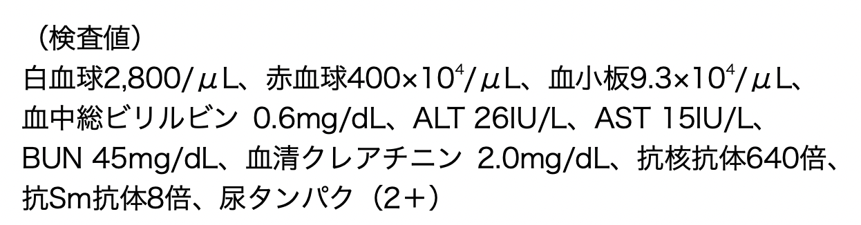 - 検査結果より、ループス腎炎は否定できる。