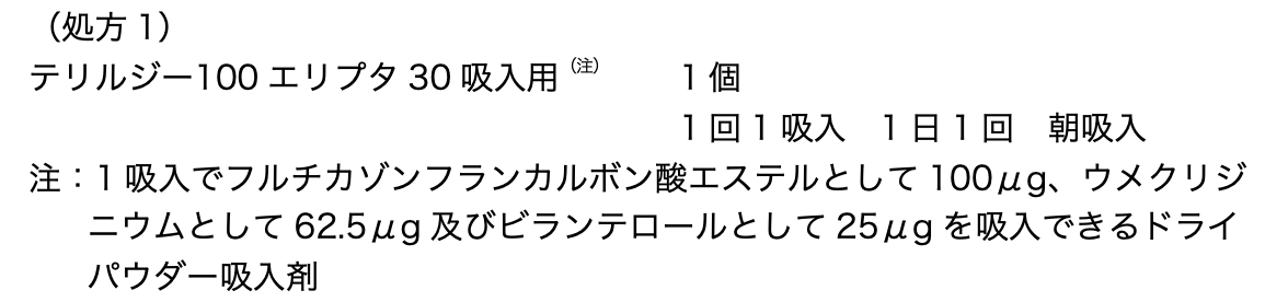 この患者が使用している吸入薬「テリルジー100エリプタ」には、3種類の有効成分が含まれている。
