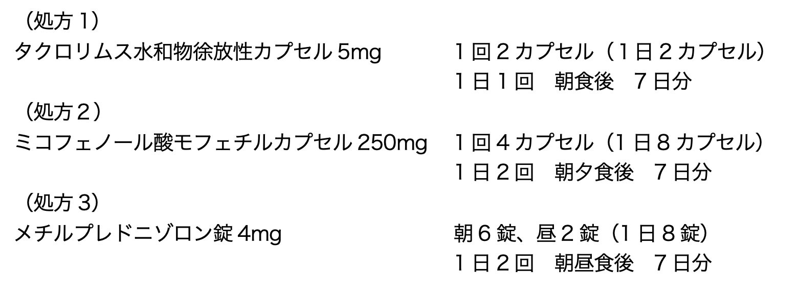 40歳男性。身長172cm、体重70kg。今回、生体腎移植を受けるために入院した。移植後の拒絶反応予防のために、以下の処方が開始された。