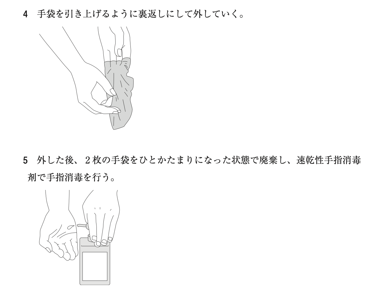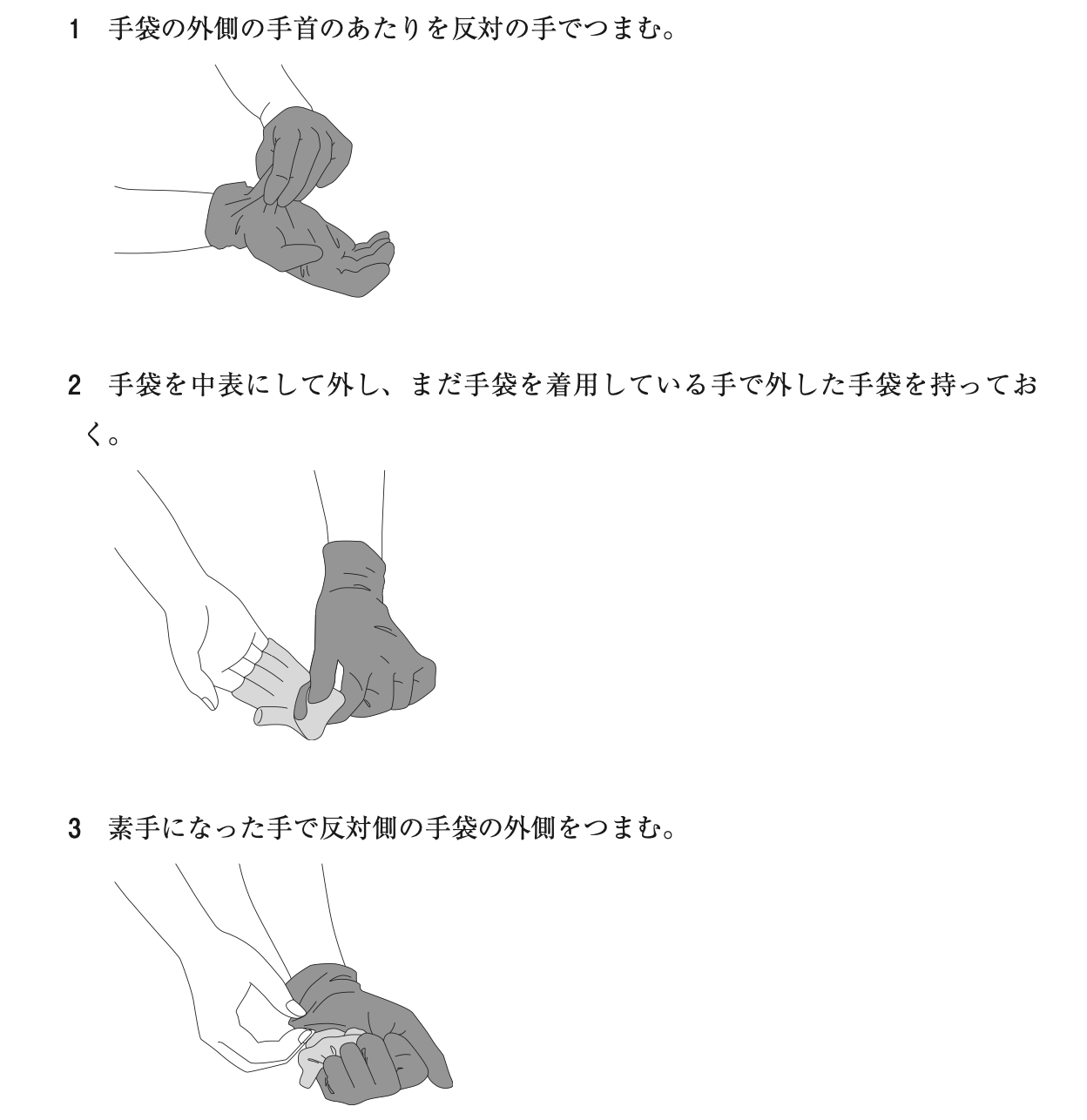 第110回薬剤師国家試験 問338 2025 6/04 第110回薬剤師国家試験 手袋を外す時の手技について、感染対策上、誤っているのはどれか。1つ選べ。ただし、手袋の外側を濃い色で、内側を薄い色で示している。 解答・解説 解答 3 解説 医療・介護現場において、使用済み手袋の外側は汚染されていると想定することが原則である。そのため、素手で手袋の外側に触れないようにすることが重要であり、感染拡大を防ぐための基本である。 第110回薬剤師国家試験 よかったらシェアしてね! URLをコピーしました! 第110回薬剤師国家試験 問318〜319 第110回薬剤師国家試験 問342 関連記事 第110回薬剤師国家試験 問167 2025年3月31日 第110回薬剤師国家試験 問130 2025年3月30日 第110回薬剤師国家試験 問342 2025年3月30日 第110回薬剤師国家試験 問318〜319 2025年3月30日 第110回薬剤師国家試験 問306〜307 2025年3月30日 第110回薬剤師国家試験 問276〜277 2025年3月30日 第110回薬剤師国家試験 問274〜275 2025年3月30日 第110回薬剤師国家試験 問254〜255 2025年3月30日 コメント コメントする コメントをキャンセルコメント ※ 名前 メール サイト