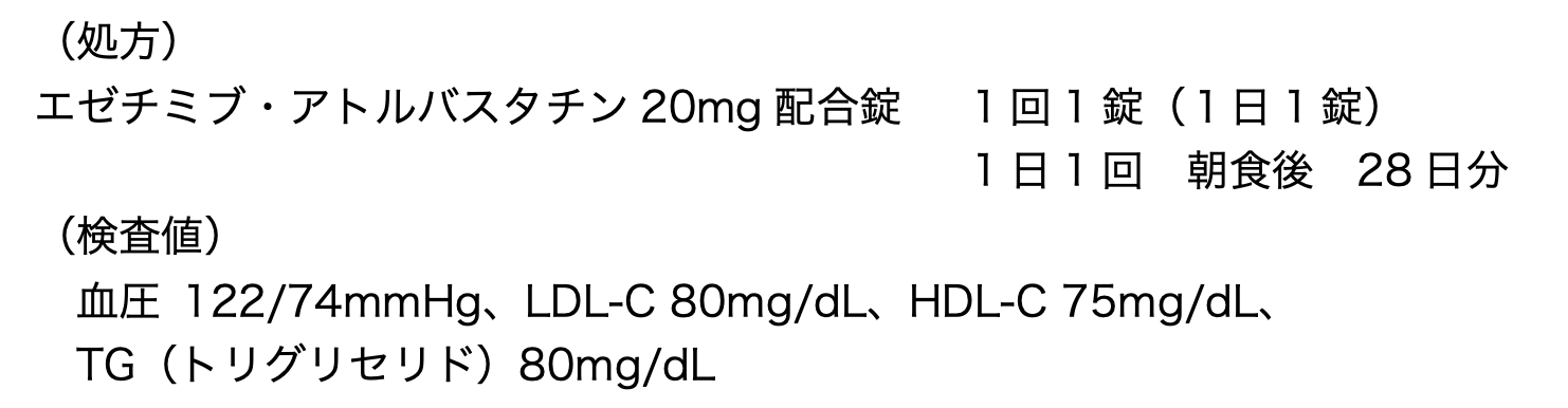 32歳女性。半年前に家族性高コレステロール血症と診断され、生活習慣の改善及び以下の処方の薬剤による治療を行っている。冠動脈疾患の既往歴はない。LDL-Cは管理目標値まで下げることができたが、本日の診察の際に患者から「妊娠の可能性がある」との報告があり、薬剤の変更が検討された。
