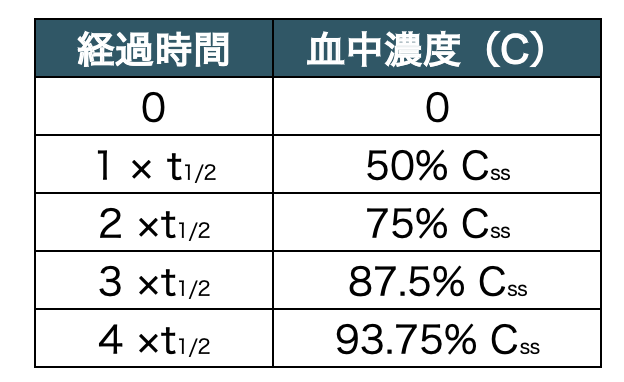 第110回薬剤師国家試験 問47 2025 9/18 第110回薬剤師国家試験 体内動態が線形1-コンパートメントモデルに従い、消失半減期が2時間である薬物を静脈内定速注入する。投与開始後、薬物の血中濃度が定常状態の血中濃度の75%に到着する時間(h)はどれか。1つ選べ。 1 2 3 4 5 解答・解説 解答 4 解説 体内動態が1-コンパートメントモデルに従う薬物を静脈内定速注入(持続点滴)したとき、血中濃度(C)は時間とともに上昇し、最終的に定常状態濃度(Css)に達する。この血中濃度の上昇は、消失半減期ごとに以下のように変化する。 ・消失半減期:2時間 ・到達したい濃度:定常状態の75% 上記表より、定常状態の75%に到達するのは、2 ×t1/2=4 時間である。 第110回薬剤師国家試験 よかったらシェアしてね! URLをコピーしました! 第110回薬剤師国家試験 問56 心不全を誘発する薬 第110回薬剤師国家試験 問58 循環器系疾患 関連記事 第110回薬剤師国家試験 問167 2025年3月31日 第110回薬剤師国家試験 問130 2025年3月30日 第110回薬剤師国家試験 問342 2025年3月30日 第110回薬剤師国家試験 問338 2025年3月30日 第110回薬剤師国家試験 問318〜319 2025年3月30日 第110回薬剤師国家試験 問306〜307 2025年3月30日 第110回薬剤師国家試験 問276〜277 2025年3月30日 第110回薬剤師国家試験 問274〜275 2025年3月30日 コメント コメント一覧 (1件) 管理者 様 こんにちは。 国試問題をきれいに整理していただき、ありがとうございます。 第110回も早々に確認できるようにしていただき、ありがとうございます。 第110回問47ですが、第110回問57が表示されているようです。 ご確認の程、よろしくお願いします。 返信 コメントする コメントをキャンセルコメント ※ 名前 メール サイト