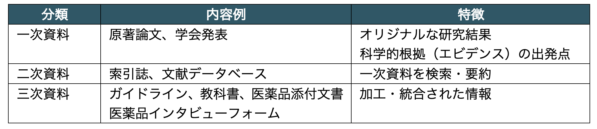 第110回薬剤師国家試験 問69 一次資料 2025 5/16 第110回薬剤師国家試験 以下の医薬品情報源のうち、一次資料はどれか。1つ選べ。 ガイドライン 索引誌 医薬品インタビューフォーム 原著論文 医薬品添付文書 解答・解説 解答 4 解説 医薬品情報源は、加工の有無や目的に応じて、「一次資料」「二次資料」「三次資料」に分類される。 第110回薬剤師国家試験 よかったらシェアしてね! URLをコピーしました! 第110回薬剤師国家試験 問68 胆石症 第110回薬剤師国家試験 問70 レジオネラ肺炎 関連記事 第110回薬剤師国家試験 問167 2025年3月31日 第110回薬剤師国家試験 問130 2025年3月30日 第110回薬剤師国家試験 問342 2025年3月30日 第110回薬剤師国家試験 問338 2025年3月30日 第110回薬剤師国家試験 問318〜319 2025年3月30日 第110回薬剤師国家試験 問306〜307 2025年3月30日 第110回薬剤師国家試験 問276〜277 2025年3月30日 第110回薬剤師国家試験 問274〜275 2025年3月30日 コメント コメントする コメントをキャンセルコメント ※ 名前 メール サイト