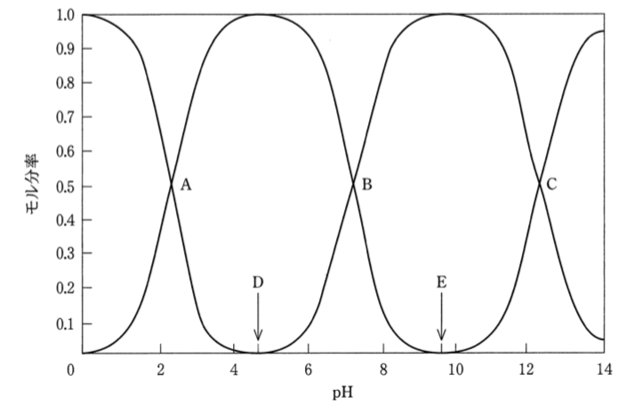 - 点DのpHでは、ほとんどがH2Y-として存在し、点EのpHではほとんどがHY2-として存在している。