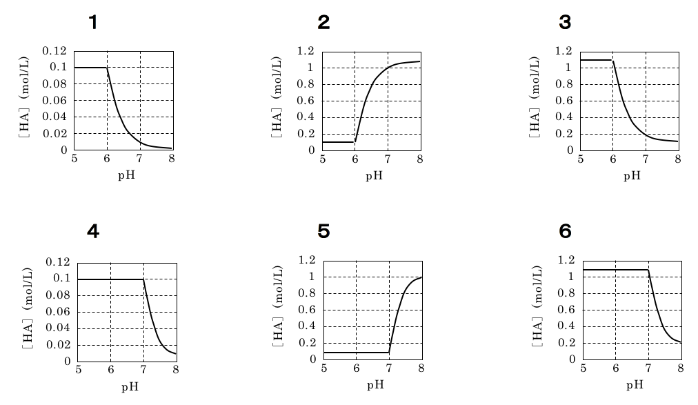 弱酸性薬物は水溶液中でHA ⇄ H++A−のように解離する。pKa 値が5.0、非解離形薬物HAの溶解度が0.1 mol/Lである弱酸性薬物の結晶0.11 molを0.01 mol/Lの塩酸0.1 Lに懸濁し、塩基Bを少量ずつ添加していくとき、pH5からpH8における溶解した非解離形薬物濃度[HA]を示すグラフは次のどれか。1つ選べ。ただし、HA及びA−は塩酸及び塩基Bと反応せず、結晶の溶解及び塩基Bの添加による体積変化は無視できるものとする。