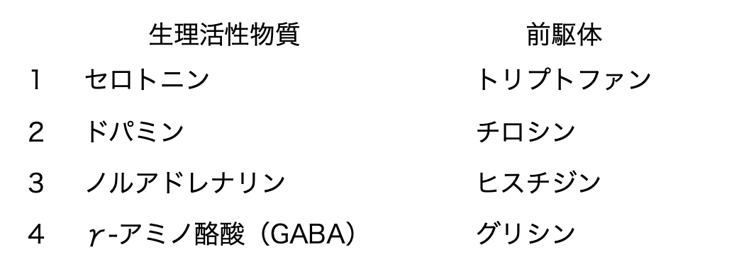 第96回薬剤師国家試験 問59(基礎薬学) 生理活性物質 2023 1/19 第96回薬剤師国家試験 生理活性物質とその前駆体との対応のうち、正しいのはどれか。2つ選べ。 解答・解説 解答 1、2 解説 1 正 セロトニンの前駆物質は、トリプトファンである。 2 正 ドパミンの前駆物質は、チロシンである。 3 誤 ノルアドレナリンの前駆物質は、チロシンである。 4 誤 γ-アミノ酪酸(GABA)の前駆物質は、グルタミン酸である。 第96回薬剤師国家試験 よかったらシェアしてね! URLをコピーしました! 第96回薬剤師国家試験 問58(基礎薬学) サイトカイン 第96回薬剤師国家試験 問60(基礎薬学) ホルモン 関連記事 第96回薬剤師国家試験 問60(基礎薬学) ホルモン 2023年1月19日 第96回薬剤師国家試験 問58(基礎薬学) サイトカイン 2023年1月19日 第96回薬剤師国家試験 問57(基礎薬学) 生理活性物質 2023年1月19日 第96回薬剤師国家試験 問56(基礎薬学) エイコサノイド 2023年1月19日 第96回薬剤師国家試験 問55(基礎薬学) 生体内イオン 2023年1月19日 第96回薬剤師国家試験 問54(基礎薬学) 遺伝子の翻訳 2023年1月19日 第96回薬剤師国家試験 問52(基礎薬学) DNAの複製 2023年1月19日 第96回薬剤師国家試験 問51(基礎薬学) 細胞分裂、細胞周期 2023年1月19日 コメント コメントする コメントをキャンセルコメント ※ 名前 メール サイト