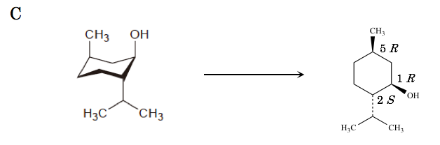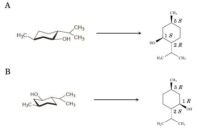 A(1S,2R,5S)とC(1R,2S,5R)の絶対配置がすべて逆であるため、CはAのエナンチオマーであり、環反転したものではない。