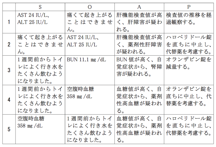 SOAP方式でこの患者の指導記録を作成した。その内容の組合せのうち、適切なものはどれか。1つ選べ。