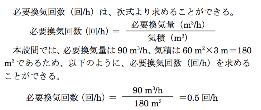 4人の患者が入院している病室の必要換気量が90 m3/hであるとき、この病室の必要換気回数(回/h)はどれか。1つ選べ。ただし、この病室は、床面積60 m2、床から天井までの高さ3 mの直方体とする。