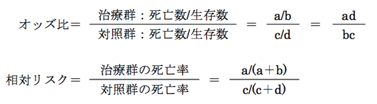 ある薬物療法において、治療群と対照群における生存数と死亡数が以下の表のように表せるとき、オッズ比と相対リスクの組合せとして、正しいのはどれか。1つ選べ。