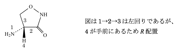 本化合物は、環状構造の4位の炭素が不斉炭素であり、S体ではなくR体である。