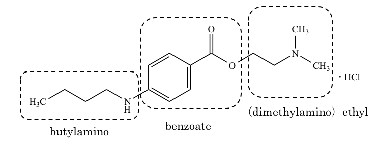 本化合物は、主たる官能基がエステルであるため、本化合物の主鎖はbenzoateである。エステルのアルコール由来の部分の名称は、(dimethylamino)ethylである。