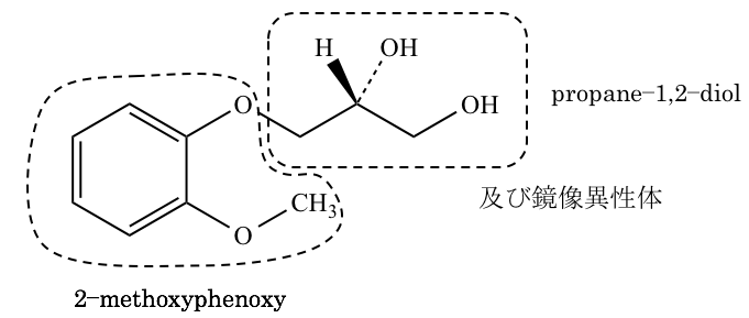 本化合物は、主たる官能基がアルコールであるため、本化合物の主鎖は、propane−1,2−diolである。主鎖の3位に2−methoxyphenoxyが結合しており、構造式に「及び構造異性体」とあることから、2位の不斉炭素がR体とS体の化合物の混合物であるラセミ体であり2RSと表記する。
