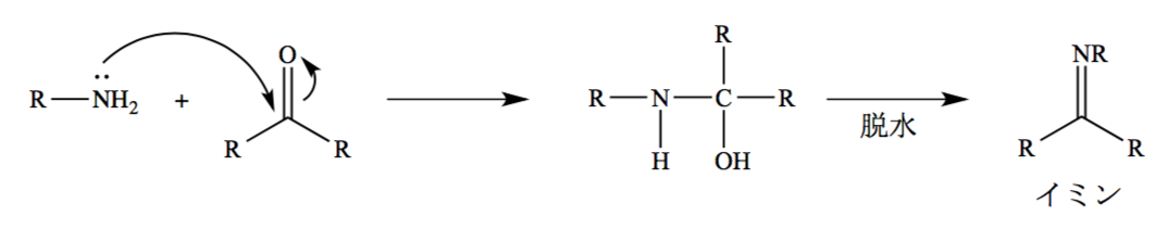 第一級アミンとケトンを反応させると、求核付加反応を起こし、その後、脱水によりイミンを生成する。