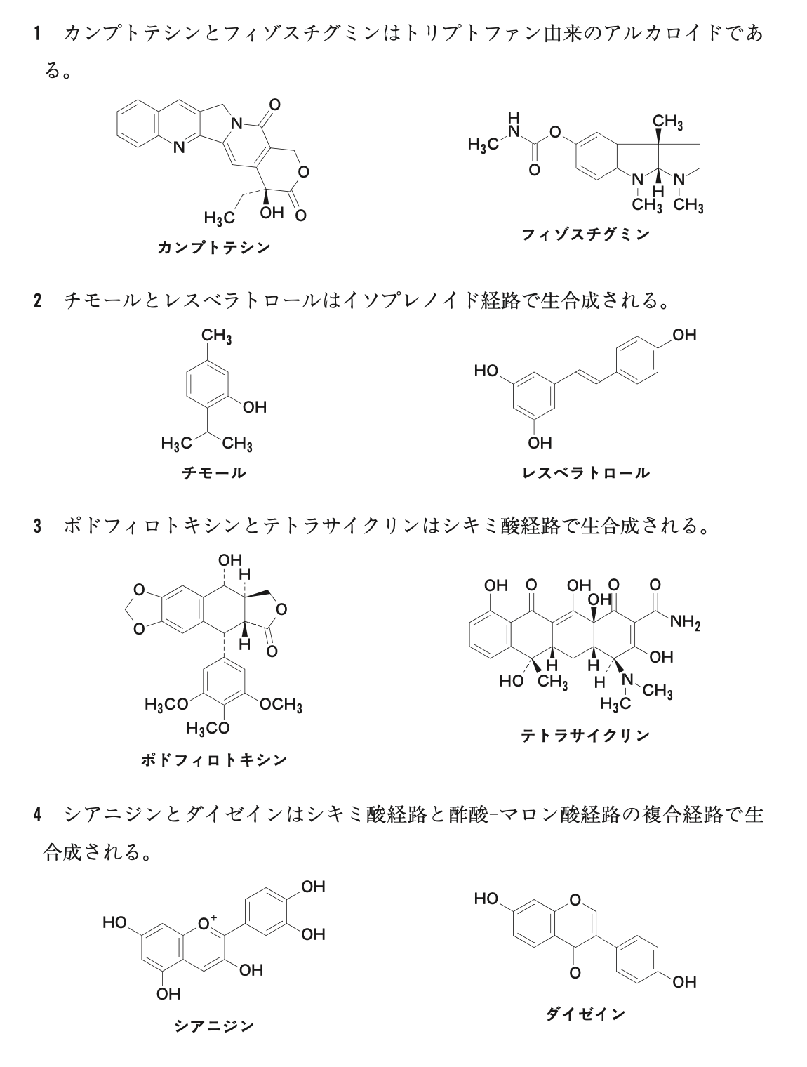 ポドフィロトキシンはリグナンであり、シキミ酸経路により生合成される。テトラサイクリンは、酢酸−マロン酸経路により生合成される。