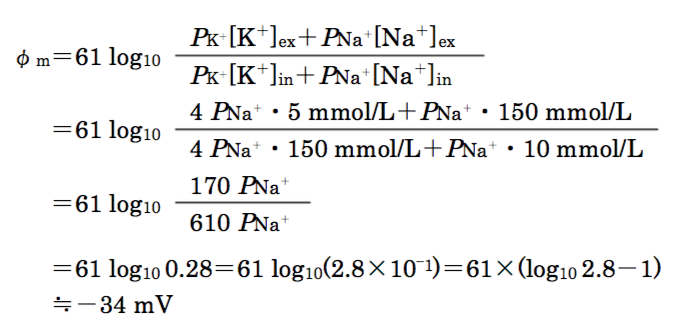 ただし、静止状態でPK+はPNa+の25倍の値を示し、一方、グリベンクラミド存在下では、PK+はPNa+の4倍にまで阻害されるとする。また、静止膜電位は-69 mV、細胞内外のイオン組成は変化しないと仮定する。