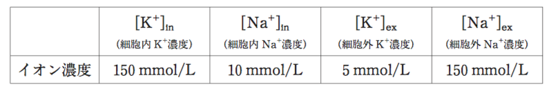 PK+はK+の膜透過係数、PNa+はNa+の膜透過係数を示す。細胞内外におけるイオンの組成は以下の表に従うとする。