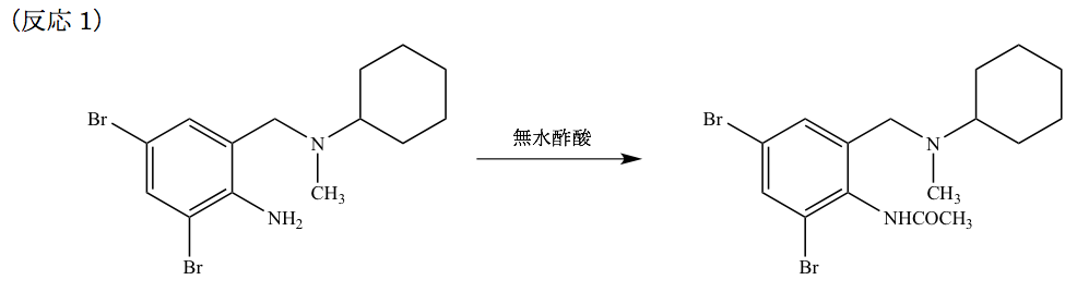 本定量法では、ブロムヘキシン溶液に無水酢酸を添加していることから、ブロムヘキシンの第1級アミンがアセチル化される(反応1)。