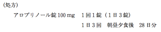 55歳男性。身長168 cm、体重82 kg。血清クレアチニン値1.8 mg/mL。気管支ぜん息の既往症がある。高尿酸血症と診断され、以下の薬剤が処方された。