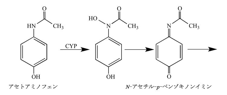 アセトアミノフェンは代謝活性化を受けて毒性を示す。活性代謝物と考えられているのはどれか。1つ選べ。