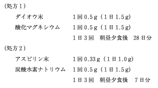 - 処方1は、混合せず別包とする。処方2は、混合すると変色する場合があるが、薬効には影響がないので、混合して分包する。