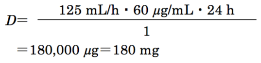 経口クリアランス(CLtot/F )が125 mL/h、平均血中濃度Cssが60 µg/mL、投与間隔τに24 hであることから、バルプロ酸ナトリウムの1日投与量を以下のように求めることができる。