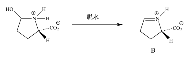 第99回薬剤師国家試験 問107 アミノ酸の生合成過程 2025 1/25 第99回薬剤師国家試験 アミノ酸(C)の生合成過程の一部を示した図に関する記述のうち、正しいのはどれか。2つ選べ。 Aはアスパラギン酸を酸化すると得られる。 AからBへの変換において生じるXは水である。 Bはラクタム構造をもつ。 BはNADHによって還元されて最終的にCになる。 Cの名称はヒスチジンである。 解答・解説 解答 2、4 解説 1 誤 Aはグルタミン酸のカルボキシ基をアルデヒド基に還元すると得られる。 2 正 AからBへの変換反応において、以下の反応が進行している。 Aの窒素が同分子内のアルデヒド炭素を求核攻撃することにより環状構造が生成する。 生成した環状構造から水が脱離する(脱水反応が起こる)。 3 誤 Bはアミド構造を有していないため、ラクタム構造を持たない。 4 正 BはNADHの作用により2つのH原子を受け取ってCになっていることから、BはNADHによって還元されて最終的にCになると考えられる。 5 誤 Cの名称はプロリンである。 第99回薬剤師国家試験 よかったらシェアしてね! URLをコピーしました! 第99回薬剤師国家試験 問106(理論問題) アルドール縮合 第99回薬剤師国家試験 問108 生薬 関連記事 第99回薬剤師国家試験 問345(実践問題) 過量投与 2017年8月29日 第99回薬剤師国家試験 問344 2017年8月29日 第99回薬剤師国家試験 問343(実践問題) 治療薬物モニタリング 2017年8月29日 第99回薬剤師国家試験 問342(実践問題) 医薬品の事故を防ぐ方法 2017年8月29日 第99回薬剤師国家試験 問341(実践問題) イベントに伴い予測される主な生体内反応 2017年8月29日 第99回薬剤師国家試験 問340(実践問題) 処方箋の記載事項 2017年8月29日 第99回薬剤師国家試験 問339(実践問題) 標準体重 2017年8月29日 第99回薬剤師国家試験 問338(実践問題) 注射液の調製 2017年8月29日 コメント コメント一覧 (1件) […] 第99回 問107 […] 返信 コメントする コメントをキャンセルコメント ※ 名前 メール サイト