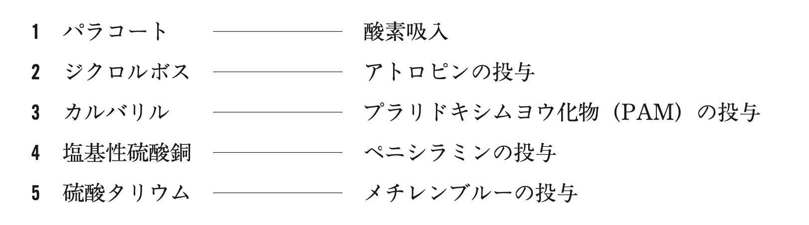 農薬とその急性中毒に対する処置・解毒法の組合せのうち、正しいのはどれか。2つ選べ。