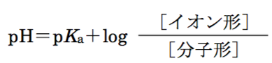 弱酸性薬物の分子形の濃度とイオン形の濃度の比は、以下の式(Henderson−Hasselbalch式)で表される。