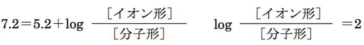 解答 解説 また、弱酸性薬物の溶解度Csは、以下の式より求めることができる。 <分子形の濃度とイオン形の濃度の比を求める> 分子形:イオン形=1:1 pH=7.2 分子形:イオン形=1:100 *pH7.2におけるイオン形分率は100/101×100≒99(約99%) <溶解度を求める> pH6.2 pH7.2 これらのことから、「pH7.2における溶解度は、pH5.2と比較して約50倍である。」解答・解説
