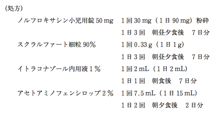 3歳男児。急性白血病で化学療法を施行中であるが、感染症治療のため、以下の処方せんが発行された。