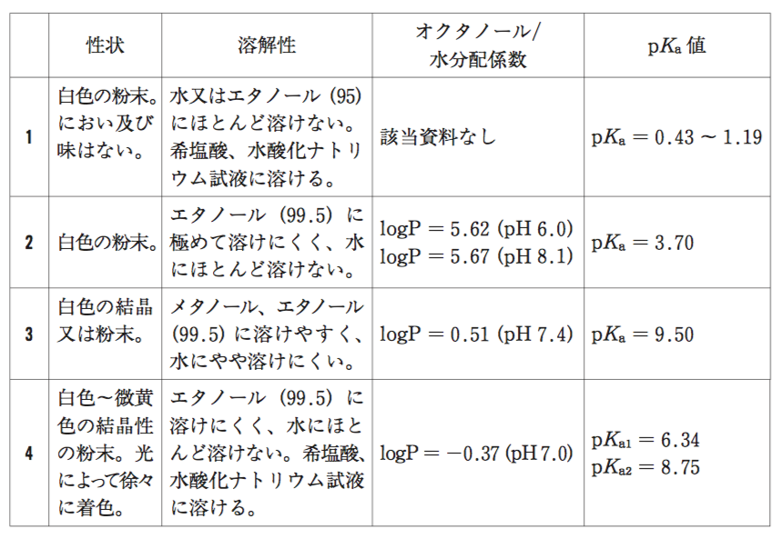 以下の表は、処方された薬物の物性を示したものである。薬物間相互作用が予想される組合せはどれか。2つ選べ。