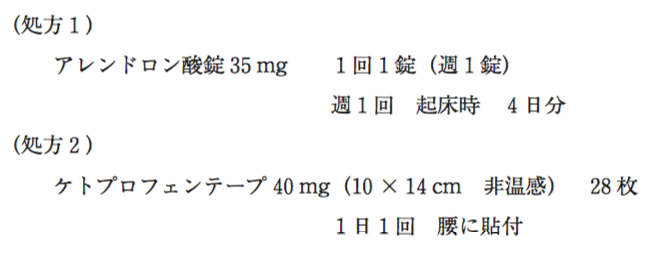 1年経過後の腰椎骨密度測定値は、若年成人平均値の65%で、半年前の値より3%下がっていた。さらに椎体骨折が1か所認められ、腰痛症状も改善されていなかった。そこで、以下の処方に変更となった。