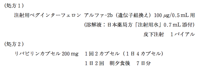 55歳男性。体重67 kg。C型慢性肝炎の治療のため、以下の薬剤が処方された。