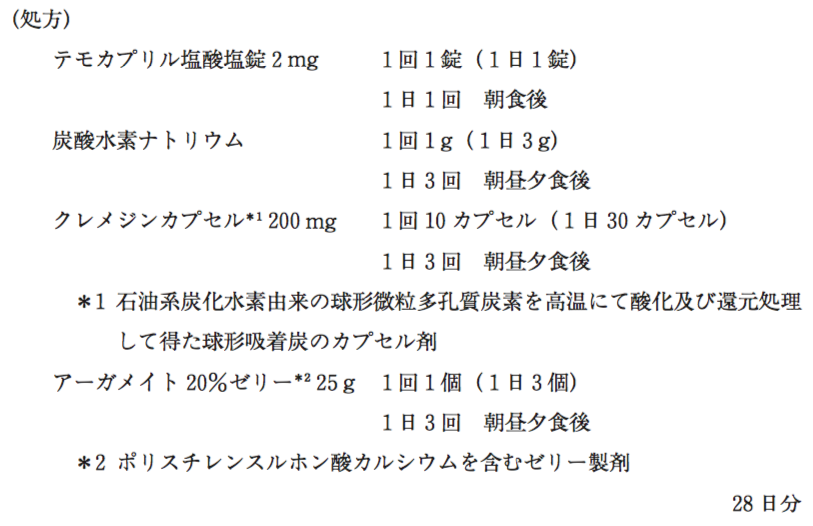 60歳女性。10年ほど前に尿タンパクを指摘されていたが放置していた。その後、疲れやすくなったため、8年ほど前に近医を受診した。腎機能低下を指摘され、薬物療法が開始された。症状は徐々に進行し、現在は慢性腎不全の保存期である(検査値:血清クレアチニン値3.0 mg/dL、血清カルシウム値8.8 mg/dL、血清リン値4.4 mg/dL、血清カリウム値5.0 mEq/L)。以下の処方を受けているが、最近、胸のむかつきなどの胃炎症状を訴えている。
