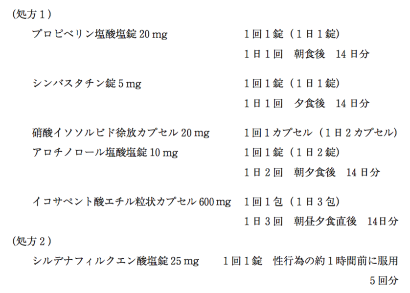 50歳男性。狭心症、脂質異常症及び頻尿で処方1の薬剤を服用していた。今回、患者の勃起不全に対し、他の医療機関から処方2の薬剤が処方された。処方2の薬剤を服用した後、患者は急激な血圧低下により意識障害を起こし救急車で病院に運ばれた。