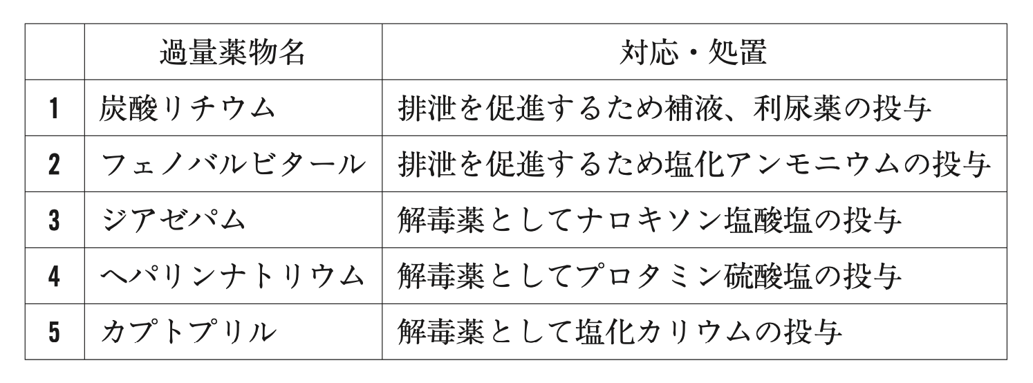 次の薬物の過量投与時の対応・処置に関する記述のうち、正しいのはどれか。2つ選べ。