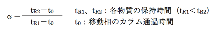 上記の式より、同一の分離条件で2つの化合物の保持時間が同じ(tR1=tR2)場合、分離係数(α)1となる。