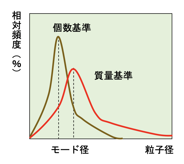 - 最も相対頻度の大きい粒子径:モード径(最頻径)が得られる。