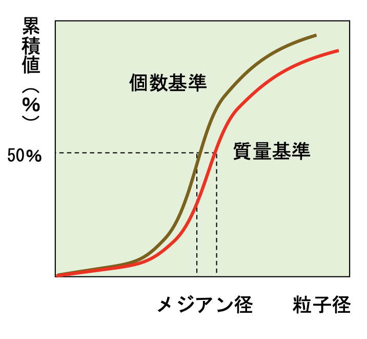 - 50%累積値に相当する粒子径:メジアン径が得られる。