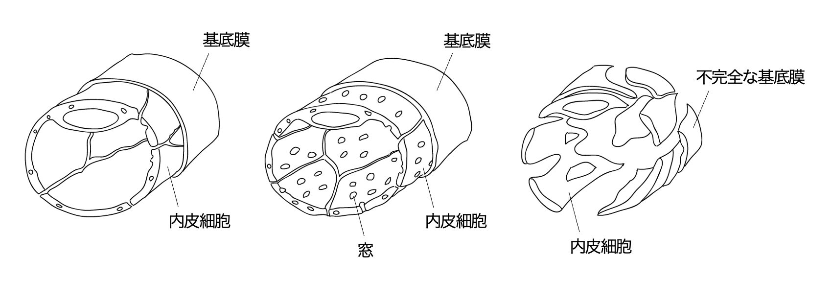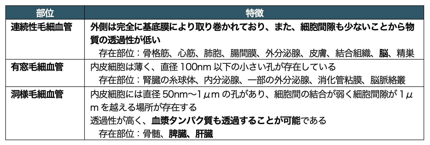 細動脈から流れてきた血液は組織中に網目状に発達した毛細血管を流れる。毛細血管壁は血管の中で最も薄く、基底膜と一層の内皮細胞のみで構成されている。毛細血管網における内腔表面積は広いため、毛細血管では効率よく栄養分や老廃物、二酸化炭素や酸素などの交換が行われる。毛細血管は分布する組織により異なり、連続性毛細血管、有窓毛細血管、洞様毛細血管の3つに分類される。